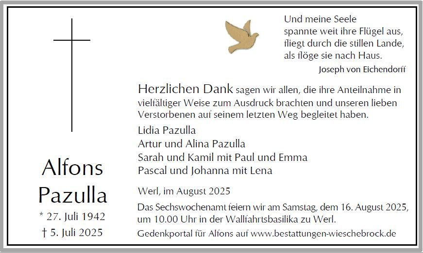 Du hast uns gelehrt was Zusammenhalt bedeutet. Nun fliegst du, wie eine Taube, hinaus aus dieser Welt – aber niemals aus unserer Familie.