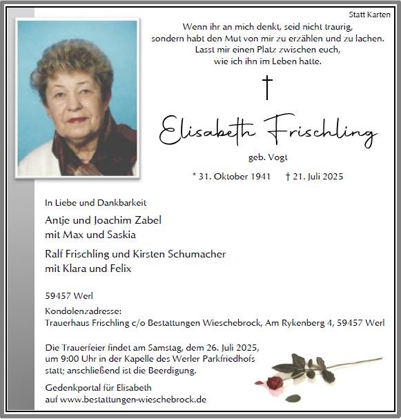 Wenn ich an meine Kindheit zurück denke, werden Sie immer ein Teil davon sein Liebe Frau Frischling, die tollste Frau hinter der Fleischtheke bei Tigges . Mögen Sie an einem wunderschönen Ort sein wo man gern an Sie zurück denkt. Danke für so schöne Erinnerungen