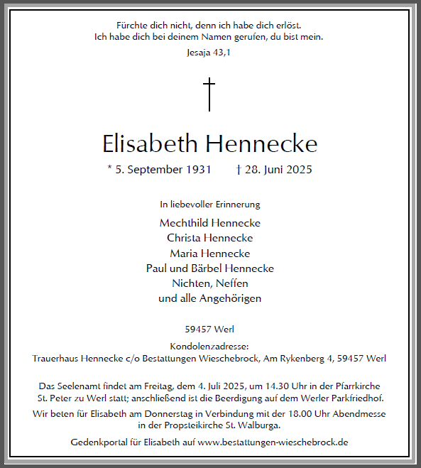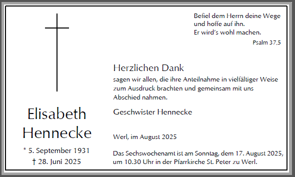 ich möchte Ihnen mein aufrichtiges Mitgefühl zum Tod von Elisabeth Hennecke aussprechen.