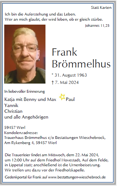 in Lippetal statt; anschließend ist die Urnenbeisetzung.