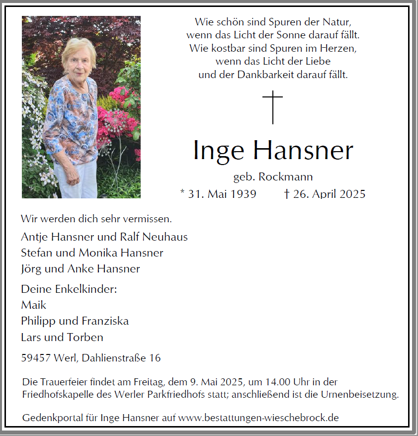 Ein schönes, helles Leben ist zu Ende gegangen. Was bleibt, ist die Gewissheit, dass Inge Eure Liebe gespürt hat und Ihr Leben durch Euch, Ihre Familie, erfüllt und glücklich war. Wir denken an Euch.