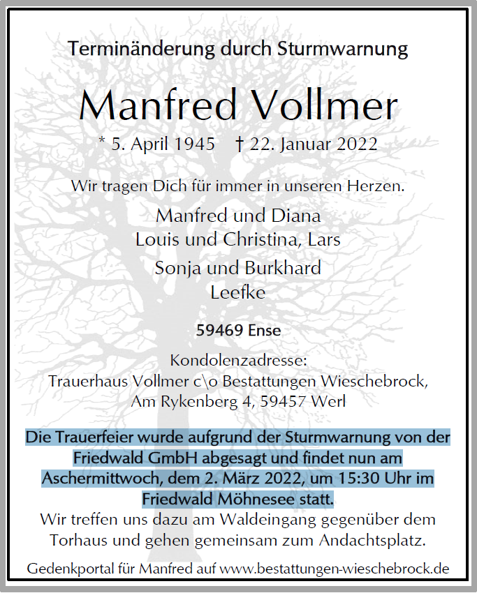 findet nun am Aschermittwoch, dem 2. März 2022, um 15:30 Uhr im Friedwald Möhnesee statt.