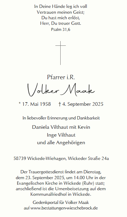 Die Evangelische Kirchengemeinde Wickede trauert um Volker Maak.