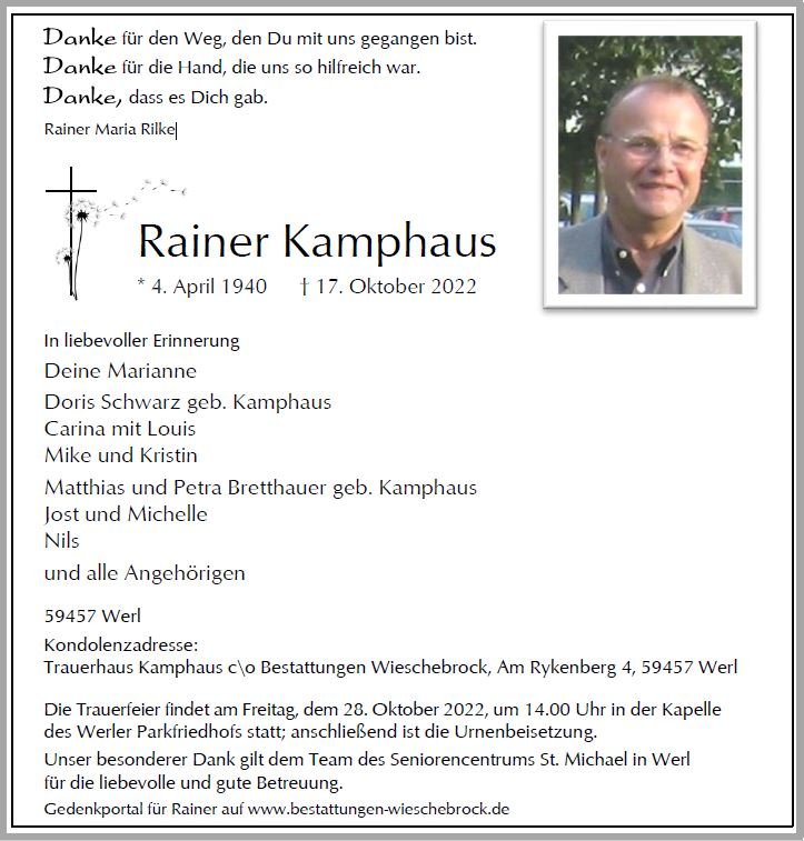 Ich habe Rainer Kamphaus als gradlinigen und zugleich liebenswürdigen Menschen kennen- und schätzen gelernt. Ich wünsche Euch, dass Ihr in den Erinnerungen an die schönen Stunden mit ihm Trost findet in der Zeit des Abschieds.