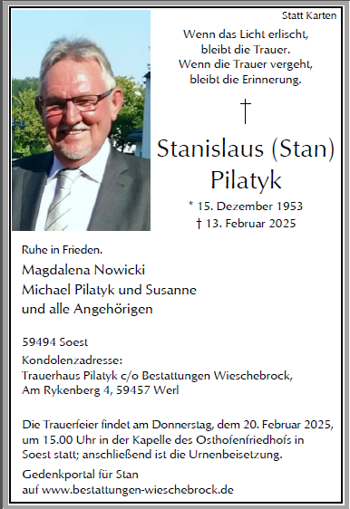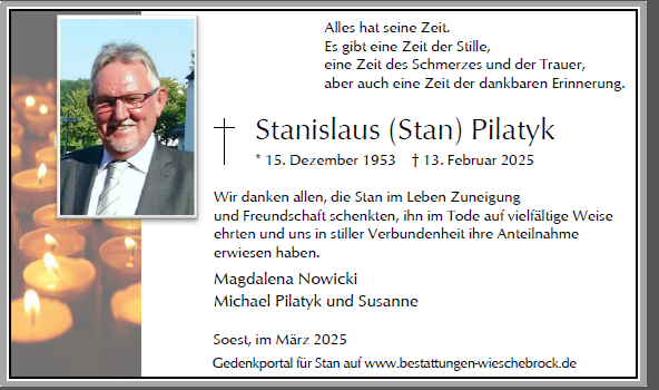 Stan, du warst ein toller Mensch und Arbeitskollege. Deine ruhige und hilfsbereite Art habe ich immer zu schätzen gewusst.