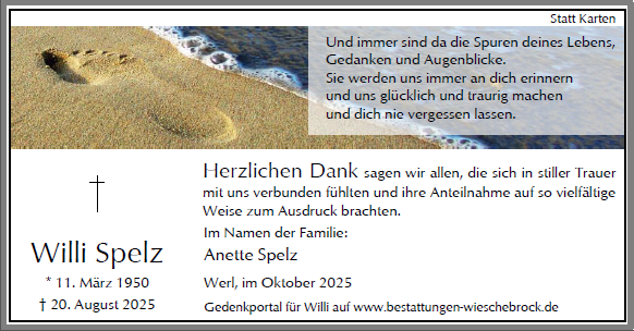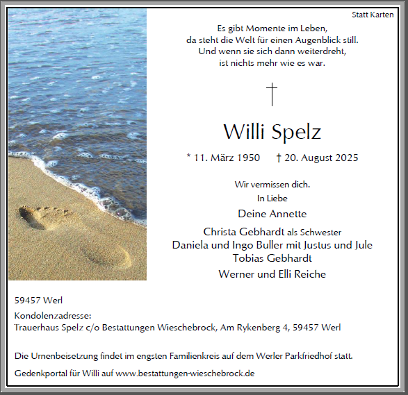 Liebe Annette, da ich keine Zeitung besitze, habe ich leider erst heute im Pfarrbrief vom Tod Deines lieben Mannes Willi gelesen.